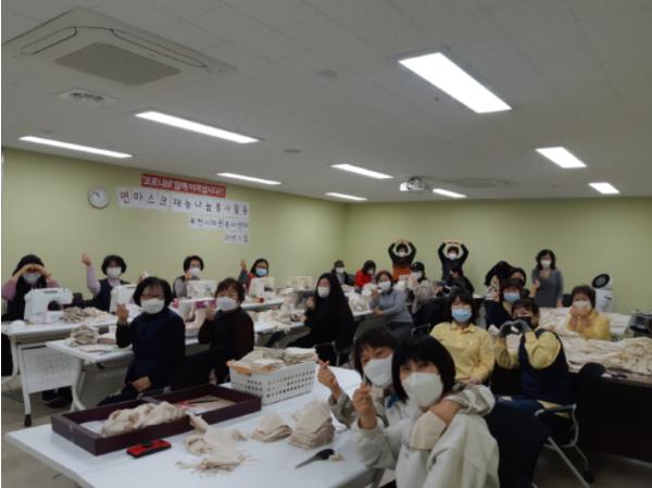 코로나19의 확산을 막기 위해 부천시자원봉사센터(이하 센터) 나눔터 리더, 나눔 지도자 및 각 단체 소속 자원봉사자 30여명이 2일 직접 오가닉천 마스크 제작에 나섰다.
