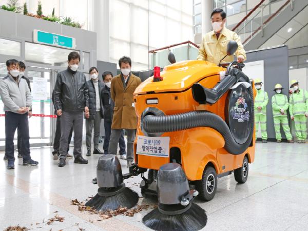 친환경 로봇청소기 노면 청소 작업은 오전 7시 30분부터 오후 3시까지 운영하며, 액체 분사장치에 소독약을 넣어 코로나19 방역작업과 청소작업을 동시에 해결해 1석2조의 효과를 거두고 있다.