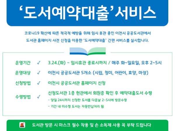 이천시(시장 엄태준)는 24일부터 한시적으로 ‘도서예약대출’ 서비스를 시행한다.