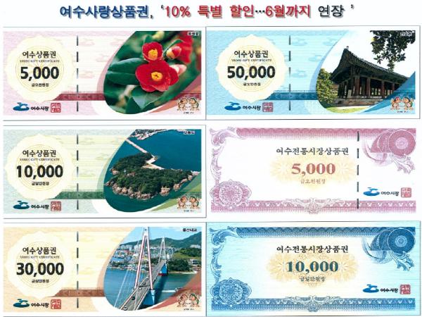 여수시(시장 권오봉)가 코로나19로 침체된 지역의 소비촉진 활성화를 위해 여수사랑상품권(여수상품권, 여수전통시장상품권) 10% 할인 판매를 6월 30일까지 연장한다고 밝혔다.