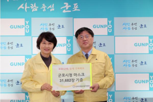 경기도군포의왕교육지원청(교육장 지명숙)은 코로나감염증바이러스-19 예방을 위해, 4월 2일(목) 군포시청에서 면마스크(필터를 포함한 1인당 1매) 총 31,682매를 지원받았다.