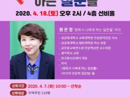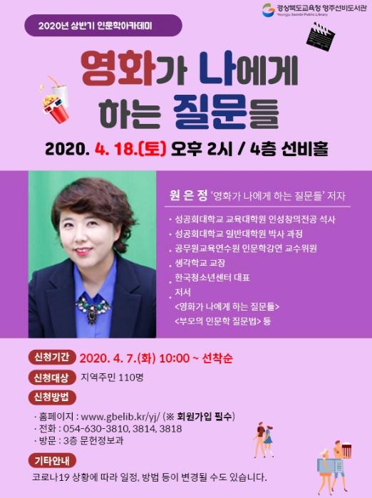 경상북도교육청 영주선비도서관(관장 최교만)은 오는 4월 18일(토) 오후 2시에 작가 겸 한국청소년센터 대표인 원은정 강사를 초청 ‘영화가 나에게 하는 질문들’을 주제로 인문학 영상강좌를 운영한다.