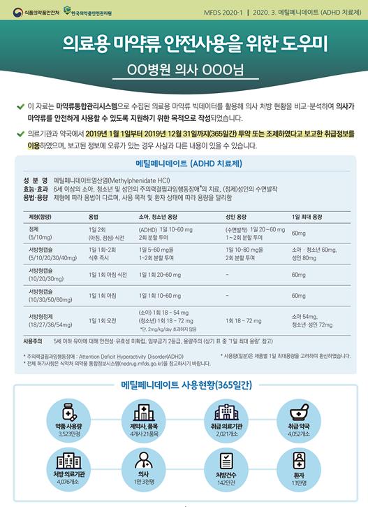 식품의약품안전처(처장 이의경)는 마약류통합관리시스템으로 수집된 정보를 활용하여 의사에게 주의력결핍 과잉행동증후군(ADHD) 치료 관련 ’의료용 마약류 안전사용을 위한 도우미’ 서한을 제공합니다.