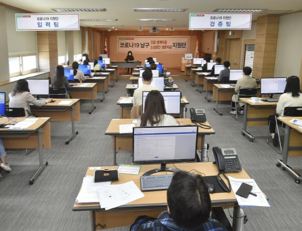 남구 긴급생계자금 지원단(단장 김영기 부구청장)은 총무인력반과 자금지원반으로 구성되어 있으며, 총무인력반은 홍보 및 신청안내문 배부, 코로나 확산예방 아크릴 칸막이 설치 등 인력 및 시설을 담당하고, 자금지원반은 신청서 접수회수, 입력검증, 민원처리, 자금배부 등 긴급생계자금 전반적인 업무를 수행한다.