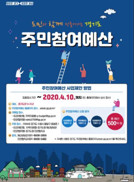 경기도가 도민과 시군, 민관이 함께 만드는 500억원 규모의 주민참여예산을 편성하기 위해 도민 제안 사업 공모를 진행한다.