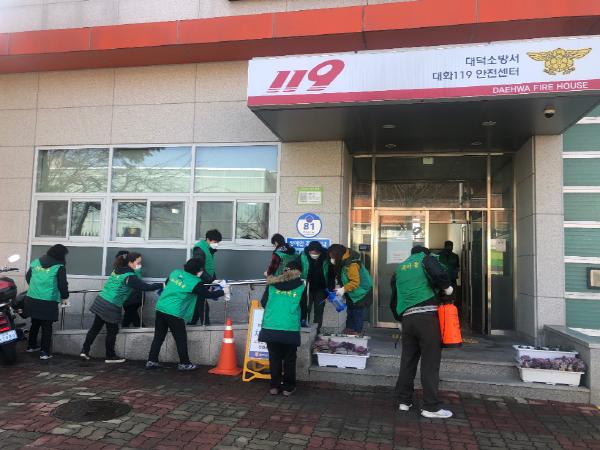 대전 대덕구 대화동 새마을단체(새마을지도자협의회, 새마을부녀회, 새마을문고회, 이하 ‘단체’)가 지난달 26일 코로나19 예방과 확산 차단을 위해 다중이용시설인 버스승강장과 공공시설에 방역 활동을 펼쳤다.